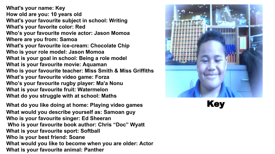 Malo Lelei, My name is Soane and I am 10 years old. I am Tongan and I have a big family. I have 7 cool brothers including me, 5 beautiful sisters and my lovely parents. My dad is an engineer and my mum stays home babysitting my little brother, cooking and cleaning. My favourite food is pasta, butter chicken and curry. I like the colour red and golden and my favourite hobby in school is writing.